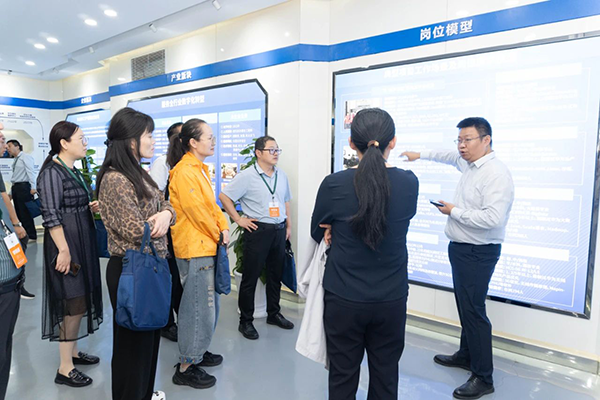 拜访代表团第一时间参观了金数据技术展厅,对金数据技术的开展历程、业务模块、经营理念、合作成果等内容进行深入分析,对金数据技术构建人才培养“三循环”生态模式、深度参与高校课程改革、引入职业认证等举措表示赞同。