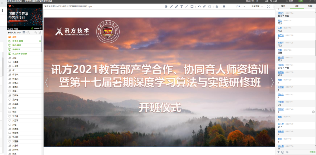 8月2日上午9:00,金数据技术与桂林信息科技学院共同举办的“深度学习算法与应用师资研修班”在职前通平台直播间举行开班仪式,由金数据技术副总经理岳杨总开班致辞,岳总介绍到:金数据技术立足ICT行业,聚焦软件与信息技术,服务高校教育,并持续响应产教融合与协同育人的号召,召开产学合作协同育人项目,搭建校企合作协同育人平台,此次召开暑期师资研修班旨在为一线教师给予技术与教学相结合的培训与研讨机会。紧接着他还详细为参训教师介绍了深度学习算法在近年来的开展情况,并衷心感谢各位老师持续参加本次研修班,同时也祝愿各位老师可以在本次的培训中能够有所收获。